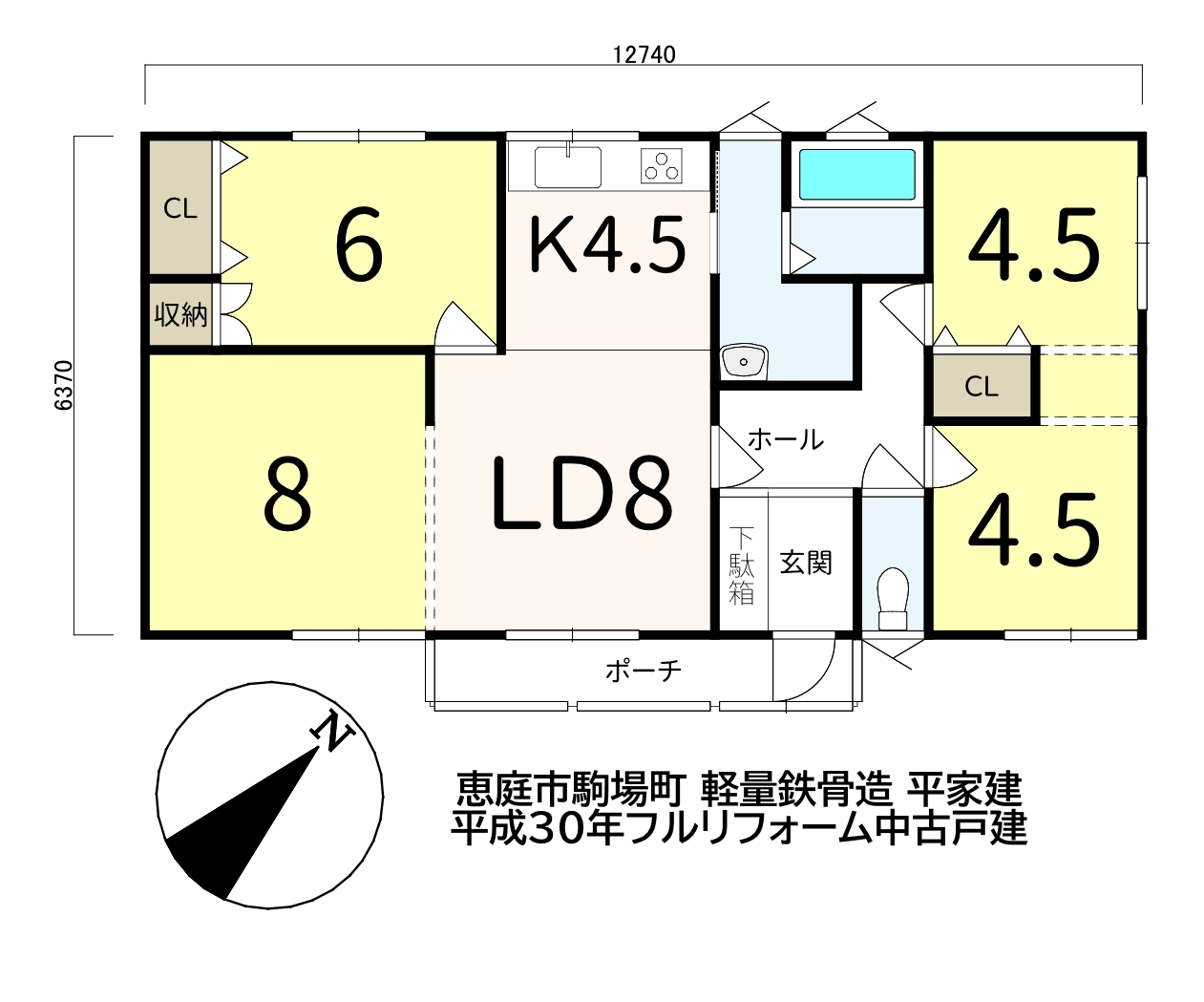 平成30年大規模住宅改修工事済み《外壁ガルバリウム貼、玄関ドア交換、住宅設備交換(システムキッチン・灯油ボイラー・一坪ユニットバス・シャンプードレッサー・温水洗浄機能付トイレ)・フロア貼替・クロス貼替》